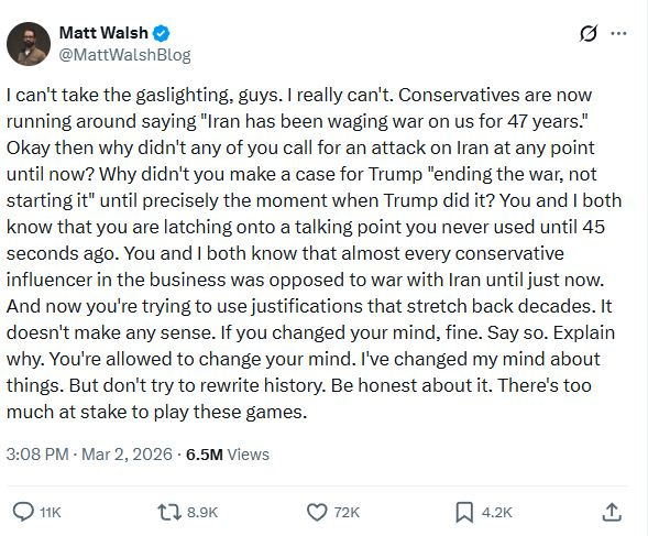 Take the argument that this is a war, but one that Iran, not the U.S., started. One can disagree with this line of reasoning, but it is an ideologically consistent thought. For most people who say they are anti-war, they are actually saying they are against non-defensive wars; few are true pacifists. Thus, this war, which they see as a response to aggression, is, in their view, defensive in nature and justified. Perhaps because this argument is ideologically consistent, it has made some on the side opposed to Operation Epic Fury, well, furious. If someone takes this stance, it can’t just be a stance that the anti-Operation Epic Fury (OEF) crowd disagrees with. No, it is actually, according to Con Inc golden boy and Curmudgeon in Chief Matt Walsh, gaslighting: